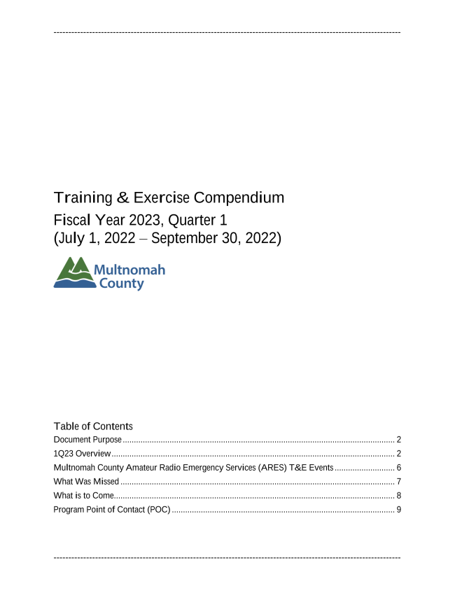 Multnomah County EM is releasing our first quarterly Training and Exercise Compendium ( Link) that provides an overview of the events taken place between July 1, 2022 and September 30, 2022 and shares the anticipated events for next quarter. This document can be found on the MCEM Training and Exercise Page.