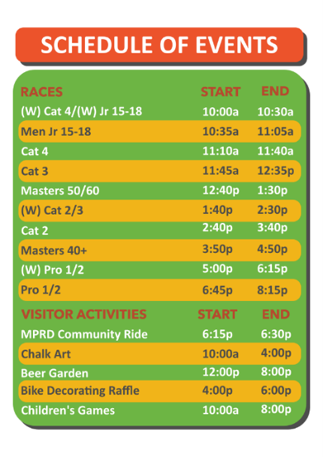 - Bring your bike and helmet and join MPRD for a casual community ride along the racecourse from 6:15 p.m. to 6:45 p.m. – enjoy the thrill of riding along the professional course to great fanfare.