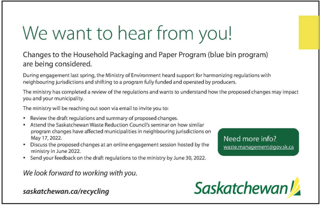 - Attend the Saskatchewan Waste Reduction Council’s seminar on how similar program changes have affected municipalities in neighbouring jurisdictions on May 17, 2022.