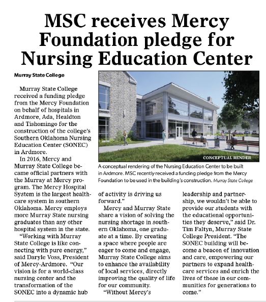 Murray State College received a funding pledge from the Mercy Foundation on behalf of hospitals in Ardmore, Ada, Healdton and Tishomingo for the construction of the college's Southern Oklahoma Nursing Education Center (SONEC) in Ardmore.