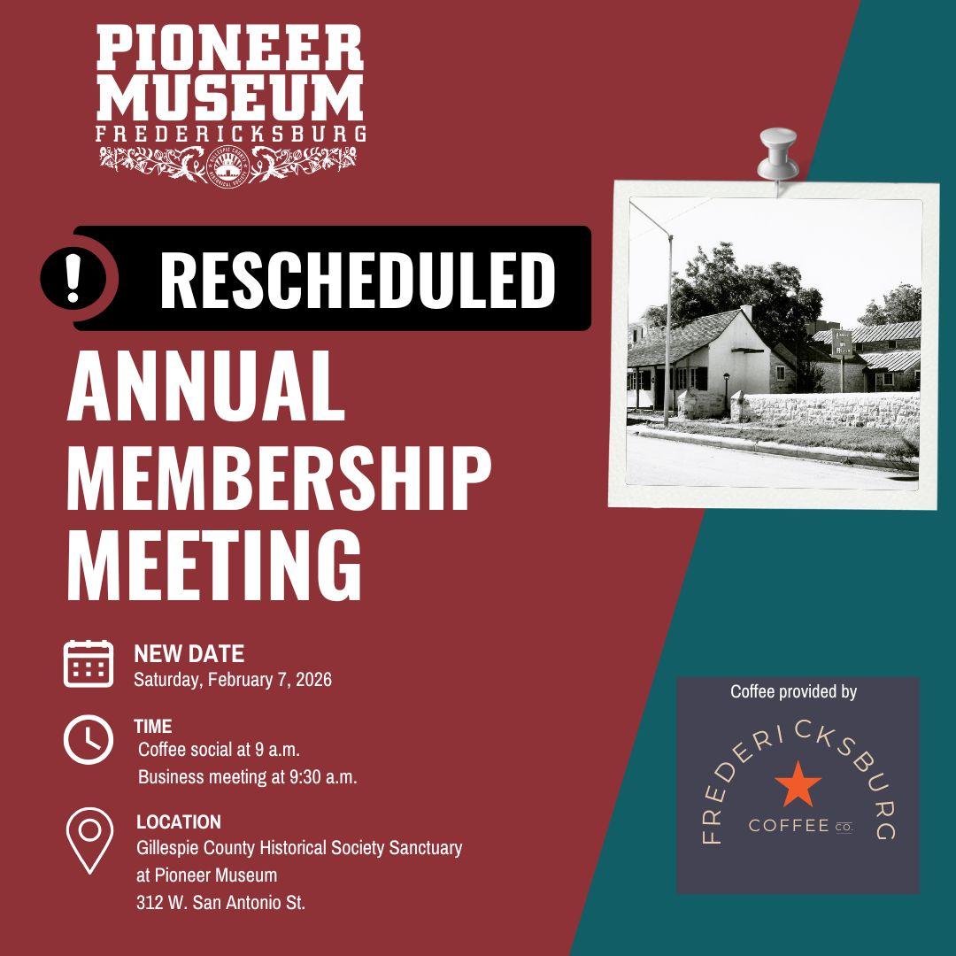 Join us for the Gillespie County Historical Society and Pioneer Museum's annual membership meeting. The meeting will be held in the Gillespie County Historical Society Sanctuary at Pioneer Museum, 312 W. San Antonio St.