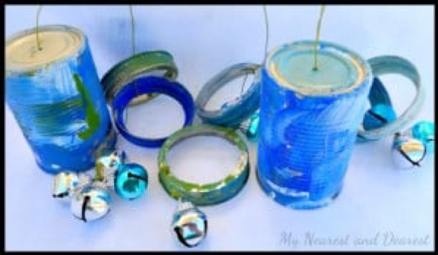 You likely have most of the supplies needed for tin can musical crafts in your recycling bin. Just decorate, hang with string and find some sturdy stick ‘mallets’ like