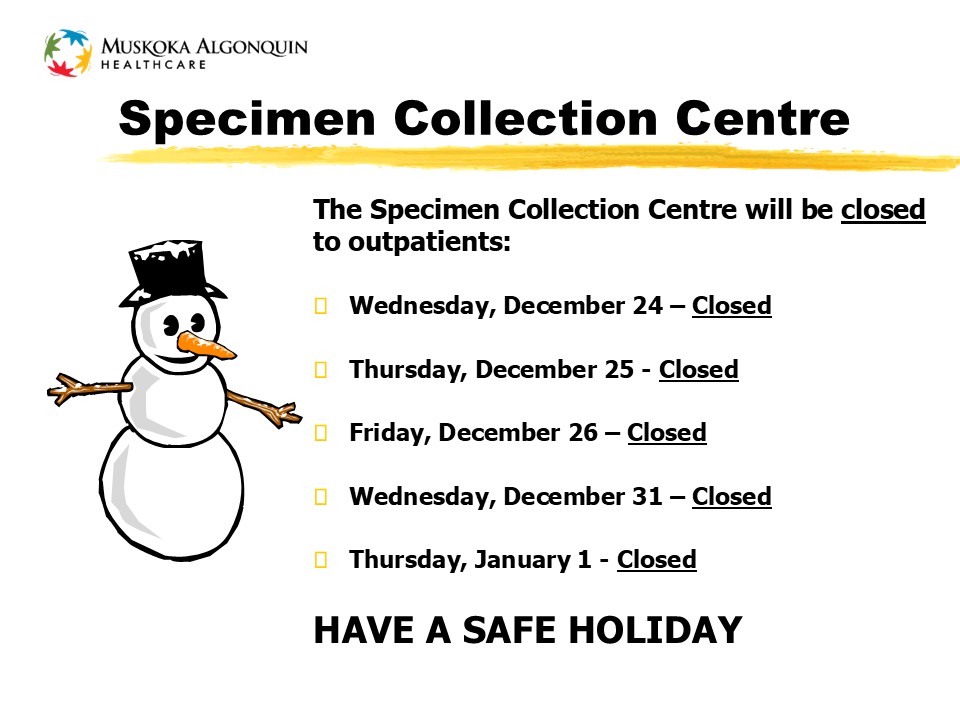 The Specimen Collection Centre operated by MAHC and Dynacare at the Almaguin Highlands Health Centre in Burk's Falls will be closed December 24-26, December 31 and January 1. Thank you for your understanding.