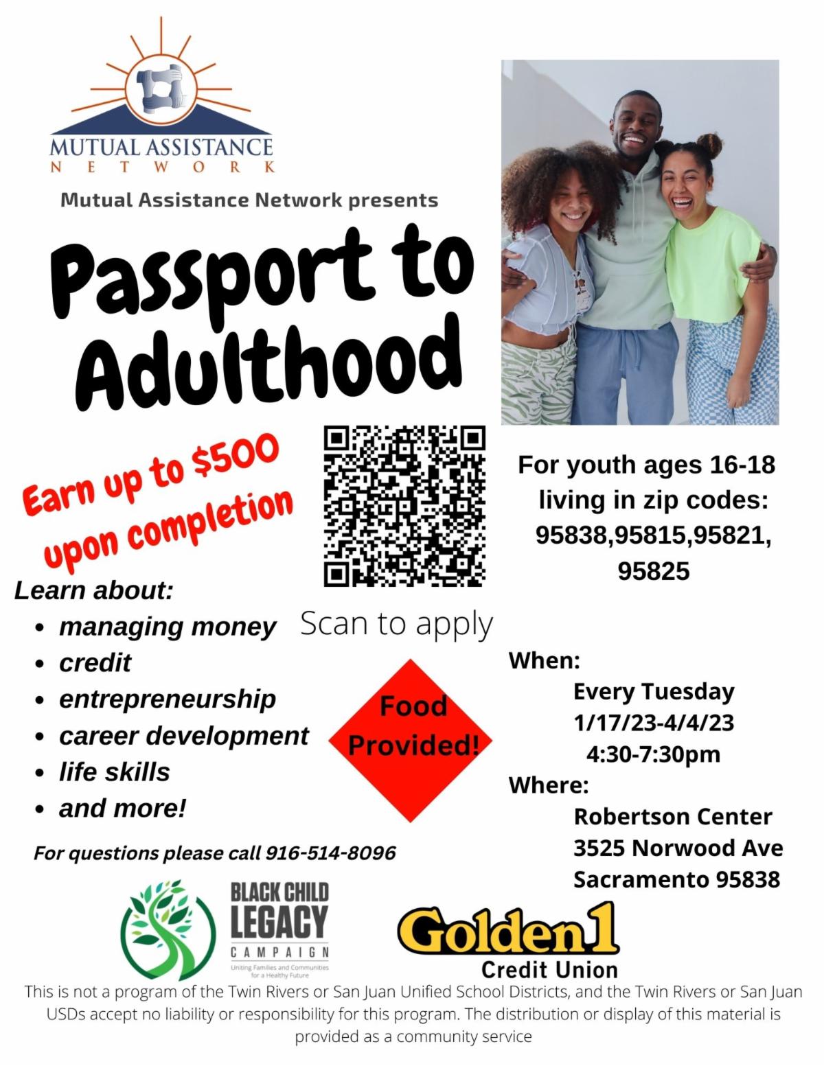We are excited to begin Passport to Adulthood next month! Youth ages 16-18 interested in learning financial skills, career preparation, life skills, and healthy social and emotional habits are encouraged to apply! Youth must reside in any of the following zip codes: 95838, 95815, 95821, 95825