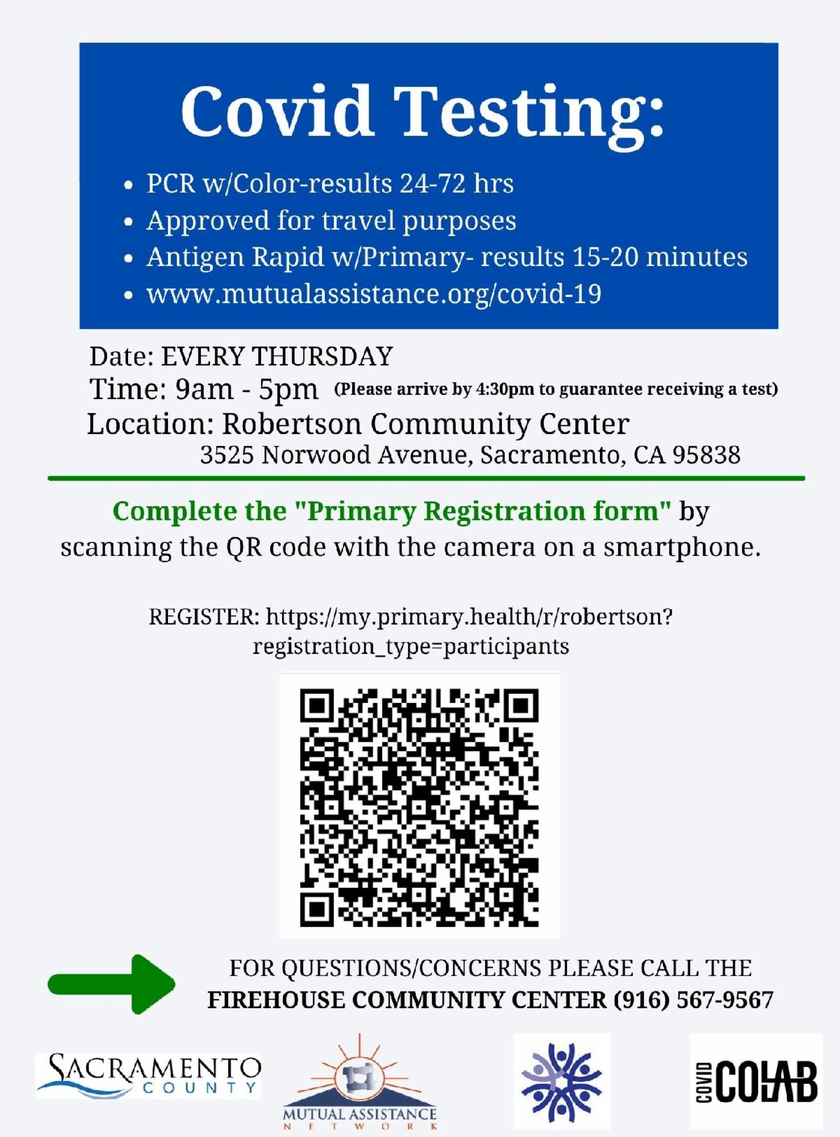 Mutual Assistance Network hosts free COVID-19 testing in partnership with Sacramento County! We are now offering both the Antigen Rapid and PCR tests. Join us every Thursday at Robertson Community Center from 9:00am - 5:00pm.