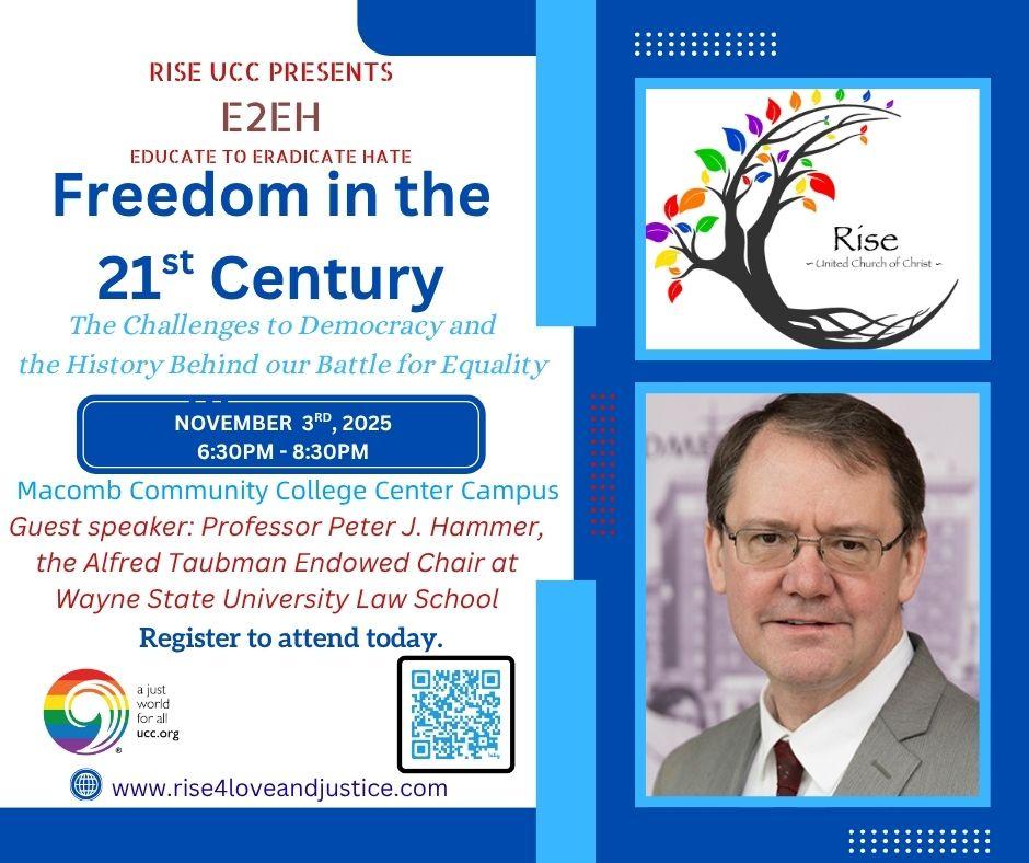 Rise UCC has opened registration for their next E2EH (Educate to Eradicate Hate) event. Freedom in the 21st Century November 3, 6:30-8:30pm at Macomb Community College Center Campus.