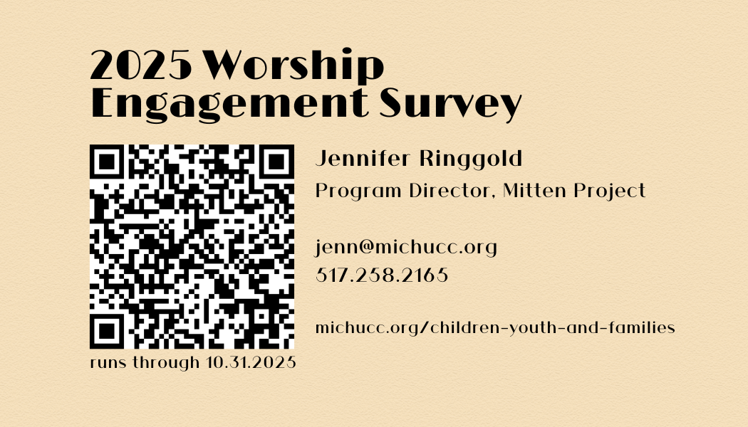 | | To date: (31%) 43 of 138 Michigan Conference UCC churches have had at least one person fill out the Worship Engagement Survey. | | | | The survey is intended for pastors, church leaders, parents, youth (ages 13-18), children (ages 3-12), and all others in Michigan Conference UCC congregations. We hope you will ask everyone in your local church to share their experience of worship in your local church setting! The survey includes a mix of multiple-choice and open-ended questions and should take approximately 10-15 minutes to complete. | | All responses are valued and will help shape the next steps in creating worship and ministry that reflect the gifts, voices, and faith journeys of all generations. Your responses are anonymous. Please be honest and know that there are no right or wrong answers. Thank you for taking the time to complete this survey about the roles of children and youth in worship and congregational life. Share the QR Code | | Feel free to copy and paste any of this content into your local church bulletin or upcoming newsletter! Share the QR code during announcements. Email the survey link to your church leadership and families https://www.research.net/r/UCCMittenProject. Ask Jenn for a printable copy of the survey for folks who have trouble with the online survey or QR code. Share in any way that works!!! | |