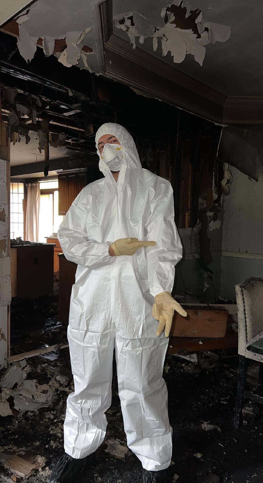 My husband and "kids" getting ready to enter the house. Wearing those white suits, to prevent getting the strong smoky smell that the fire left, impregnated in the clothes and hair.