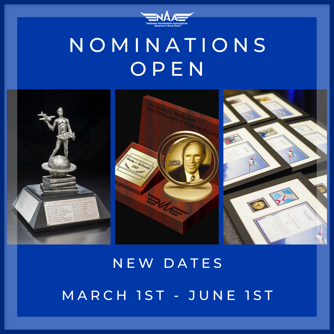 Nominations are open for the Wright Brothers Memorial Trophy, Brewer Trophy, Distinguished Statesman and Stateswoman of Aviation, and Public Benefit Flying Awards. The deadline for all these awards is June 1st.