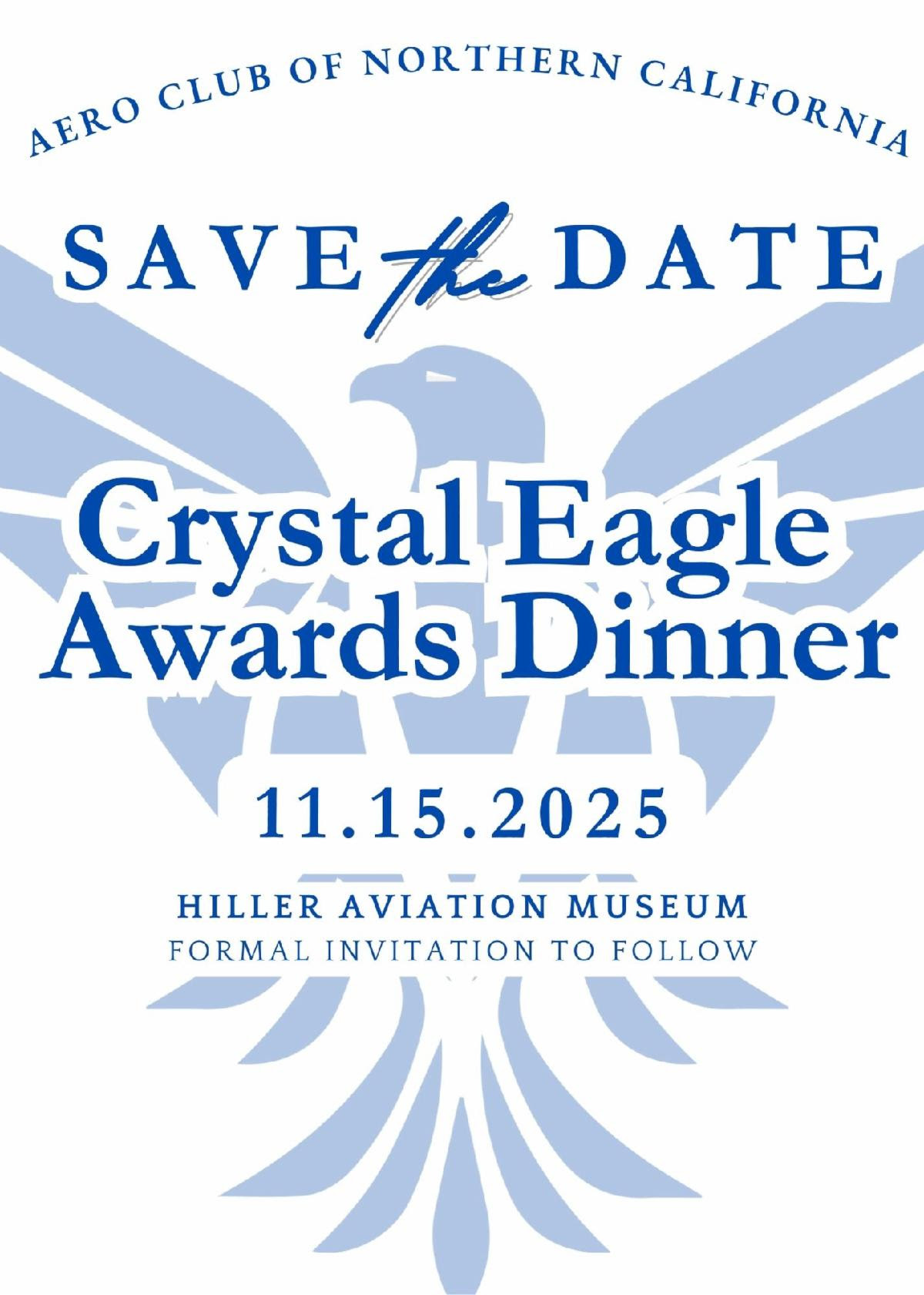 NAA Aero Club member the Aero Club of Northern California invites you to join them for their annual Crystal Eagle Awards Dinner - this year taking place on November 15th, 2025 at the Hiller Aviation Museum.