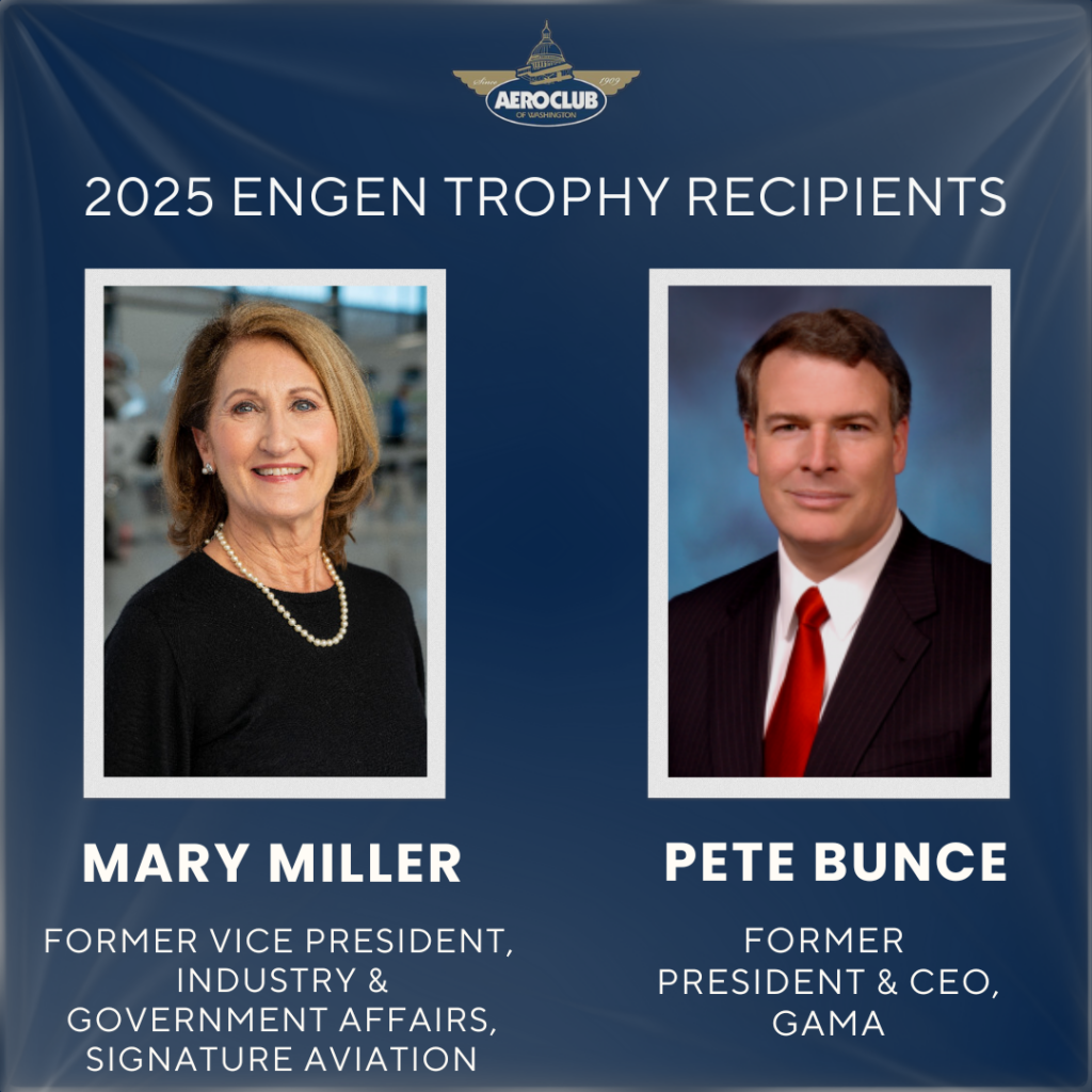 The Aero Club of Washington announced that they will honor two aviation industry luminaries with the 2025 Donald D. Engen Aero Club Trophy for Aviation Excellence: Mary Miller, former Vice President, Industry and Government Affairs, Signature Aviation and Pete Bunce, former President and CEO, General Aviation Manufacturers Association (GAMA). Both Miller and Bunce have recently retired from their long-held and distinguished positions dedicated to advocating for general and business aviation.