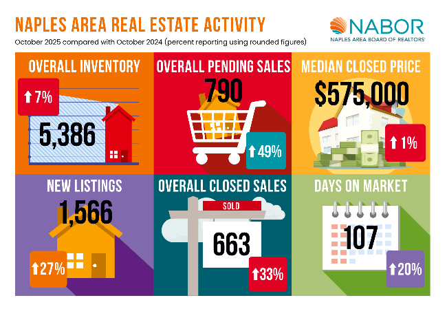 Increased foot traffic at open houses in October was a positive sign indicating the Naples housing market is building momentum as it approaches snowbird season. Buyers are responding to improved affordability. Broker analysts reviewing the October 2025 Market Report by the Naples Area Board of REALTORS® (NABOR®), which tracks home listings and sales within Collier County (excluding Marco Island), were concerned that reduced activity in the first quarter of the year – due to consumer uncertainty caused by tariffs – would linger for months; but the October report revealed not only market resilience, but a return to a balanced housing market.