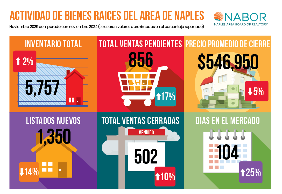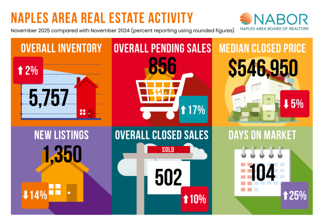 Naples, Fla. (December 26, 2025) – A gentle softening of prices during November encouraged many buyers to purchase homes for sale in Naples at a level similar to pre-pandemic home sales, even as home prices have increased 40 to 50 percent since 2019. Pending sales for November increased 16.9 percent to 856 pending sales from 732 pending sales in November 2024. The median closed price in November decreased 4.9 percent to $546,950 from $575,000 in November 2024. The median close price has declined slightly in seven of the previous eight months compared to the same months in 2024. Broker analysts reviewing the November 2025 Market Report by the Naples Area Board of REALTORS® (NABOR®), which tracks home listings and sales within Collier County (excluding Marco Island), were not surprised to see just over 1,000 price decreases during November. While minor, the price decreases indicate a growing shift away from aspirational pricing by sellers as they adapt to a new market environment where increased competition and smart pricing results in improved sales for the Naples real estate market.