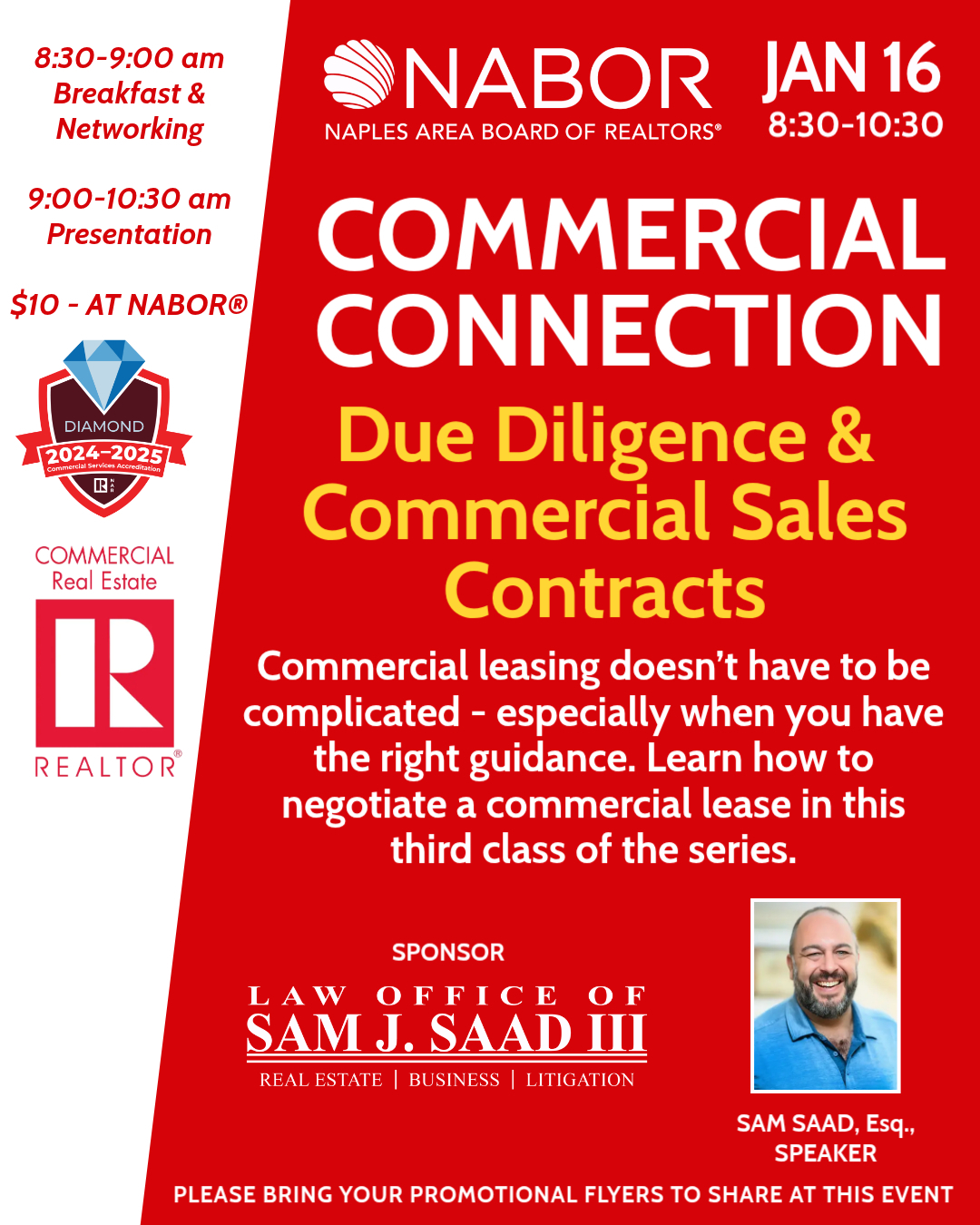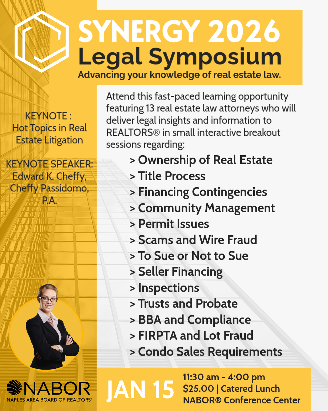 Legal Symposium – January 15 - We invite you to participate in this dynamic educational forum featuring thirteen esteemed real estate law attorneys. These professionals will provide valuable legal insights and information to REALTORS® through small, interactive sessions. Topics of discussion will include, but are not limited to, selected areas of real estate law: Ownership Real Estate · Title Process · Financing Contingencies · Community Management · Permit Issues · Scams and Wire Fraud · Default and Litigation · Seller Financing · Inspections · Trust and Probate · BBA and Compliance · FIRPTA and Lot Fraud · Condo Sales Requirements. A catered lunch and beverages will be provided. ·