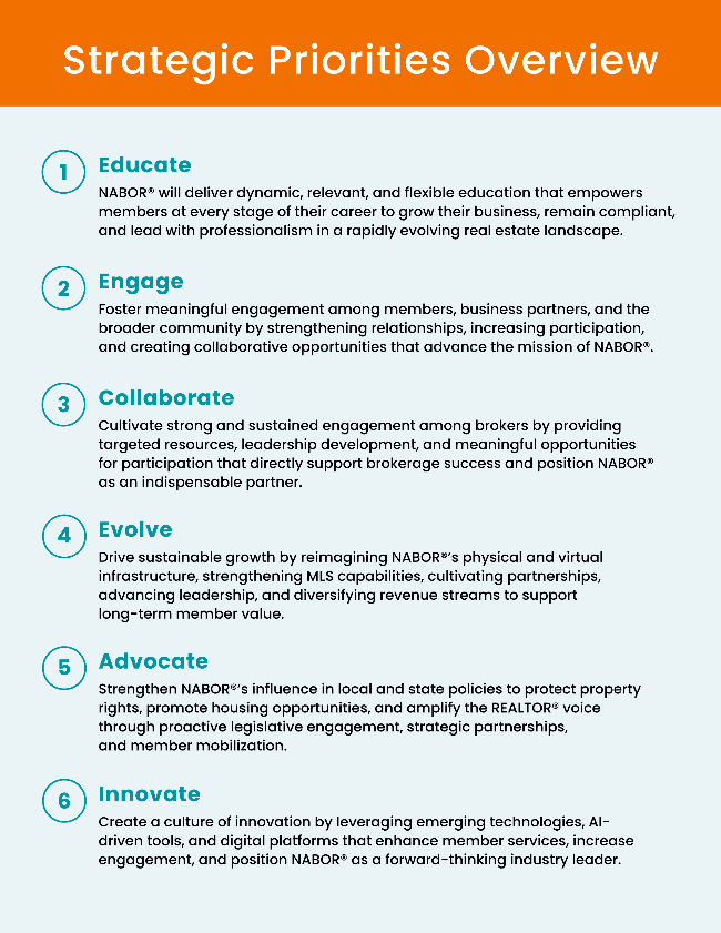 In the months ahead, NABOR® will continue strengthening the tools, education, and advocacy that support your success. We will focus on elevating professionalism, deepening community partnerships, and ensuring that our members remain informed and empowered in a rapidly evolving market. Together, we will champion the values that make our association strong: integrity, unity, and a commitment to excellence.