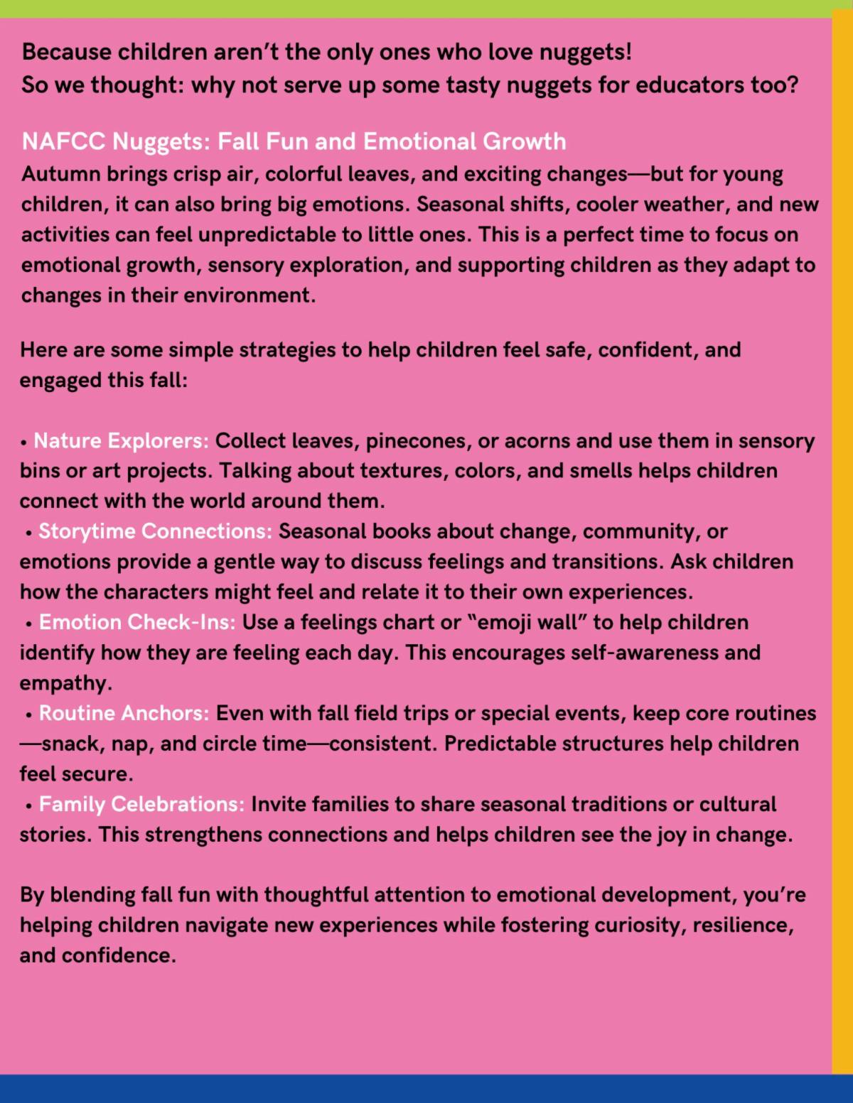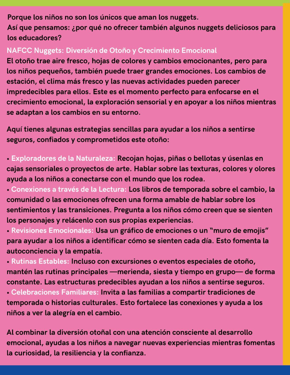 As we move into October, we close out Hispanic Heritage Month, a time to honor the rich stories, voices, and traditions that have shaped our shared history. Across the nation, Hispanic family child care educators are nurturing children with the rhythms, colors, and flavors of their heritage — bringing cultural pride and belonging to life through music, art, food, and storytelling. This month reminds us that our strength as a community comes from the diversity, resilience, and creativity we each bring to our work and to the children in our care.