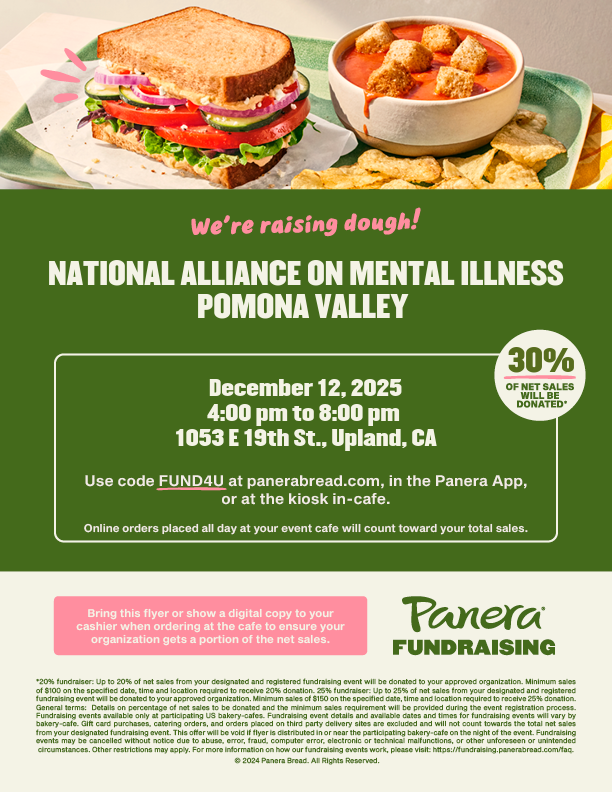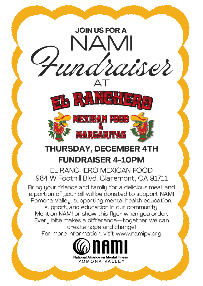 Bring your friends and family for a delicious meal, and a portion of your bill will be donated to support NAMI Pomona Valley, supporting mental health education, support, and education in our community.