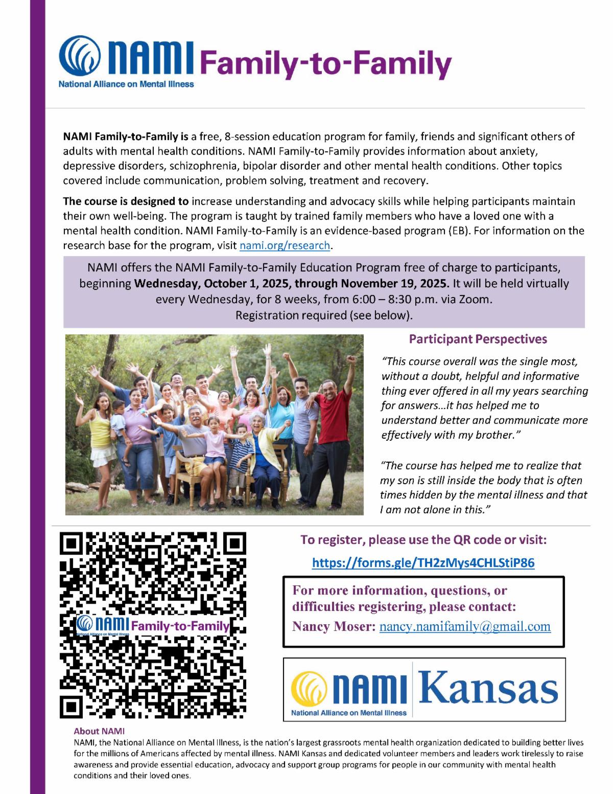 Signature Program Leaders. We are looking for signature program leaders! Are you interested in becoming a Family Support Group or Connection Recovery Support Group facilitator? Are you interested in becoming a Family-to-Family program leader? We have upcoming trainings for these in demand volunteer positions! You DO need to be a dues paying member to NAMI Wichita to become a Signature Program leader.