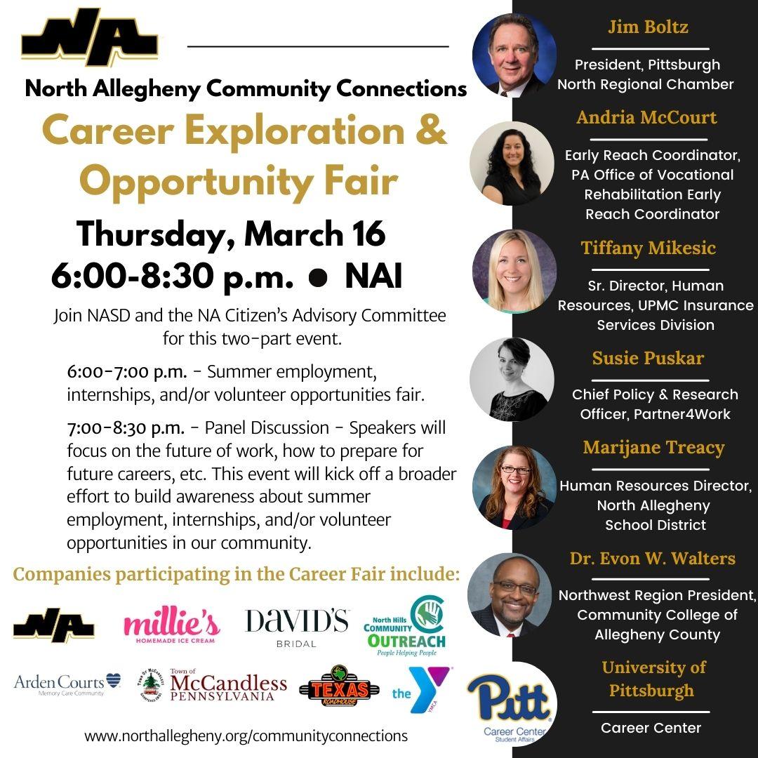 On March 16, 2023, North Allegheny School District and the NA Citizen's Advisory Committee will hold a career exploration and opportunity fair. The event is scheduled for Thursday, March 16, from 6:00-8:30 p.m. at the North Allegheny Intermediate High School (350 Cumberland Road, Pittsburgh, PA 15237). The agenda for the event includes: