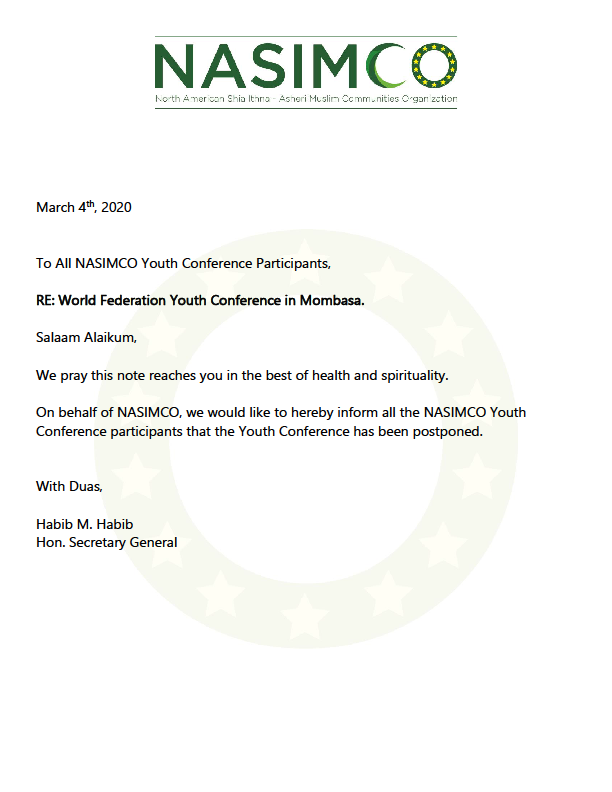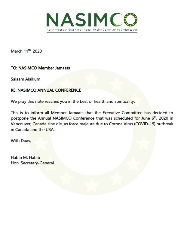 NASIMCO strongly recommends the closure of all member jamaat centers & private functions of more than 10 people, until further notice.