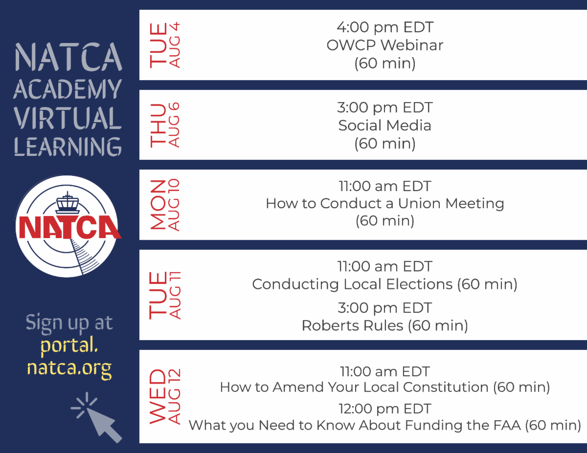 Building on the success of classes in its first couple of months, organizers of the NATCA Academy have announced a new schedule of classes for virtual learning through the end of September. We hope that you will take this opportunity to learn more about your Union, your rights, and how you can become more active in the areas that interest you.