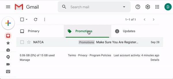 If you are a Gmail user, to increase the likelihood that you will get news and updates in your email from our Union, NATCA's IT Committee recommends that you do the following. In Gmail, your inbox is separated into four general categories: primary, promotions, social, and updates. The primary tab is reserved for direct communication between you and your contacts. Promotions is where communications from large services will generally appear. NATCA uses Constant Contact for email communication with its members, so NATCA mail will arrive in the promotions tab of your gmail inbox. Social is reserved for social media traffic, and the updates tab is meant to capture communication from services you use like online banking. Each tab is still a part of your inbox, but Gmail tries to clean things up for you by categorizing the large volume of mail you might receive.