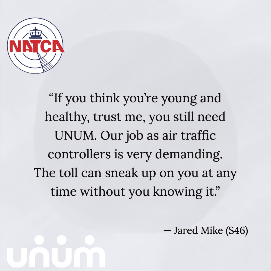 Having insurance grants peace of mind when the unexpected happens. The NATCA group long-term disability (LTD) program from Unum is the insurance that provides protection and peace of mind in the event you lose your medical or are disabled. Seattle TRACON (S46) member Jared Mike encourages all NATCA members to sign up for Unum during this open enrollment season: