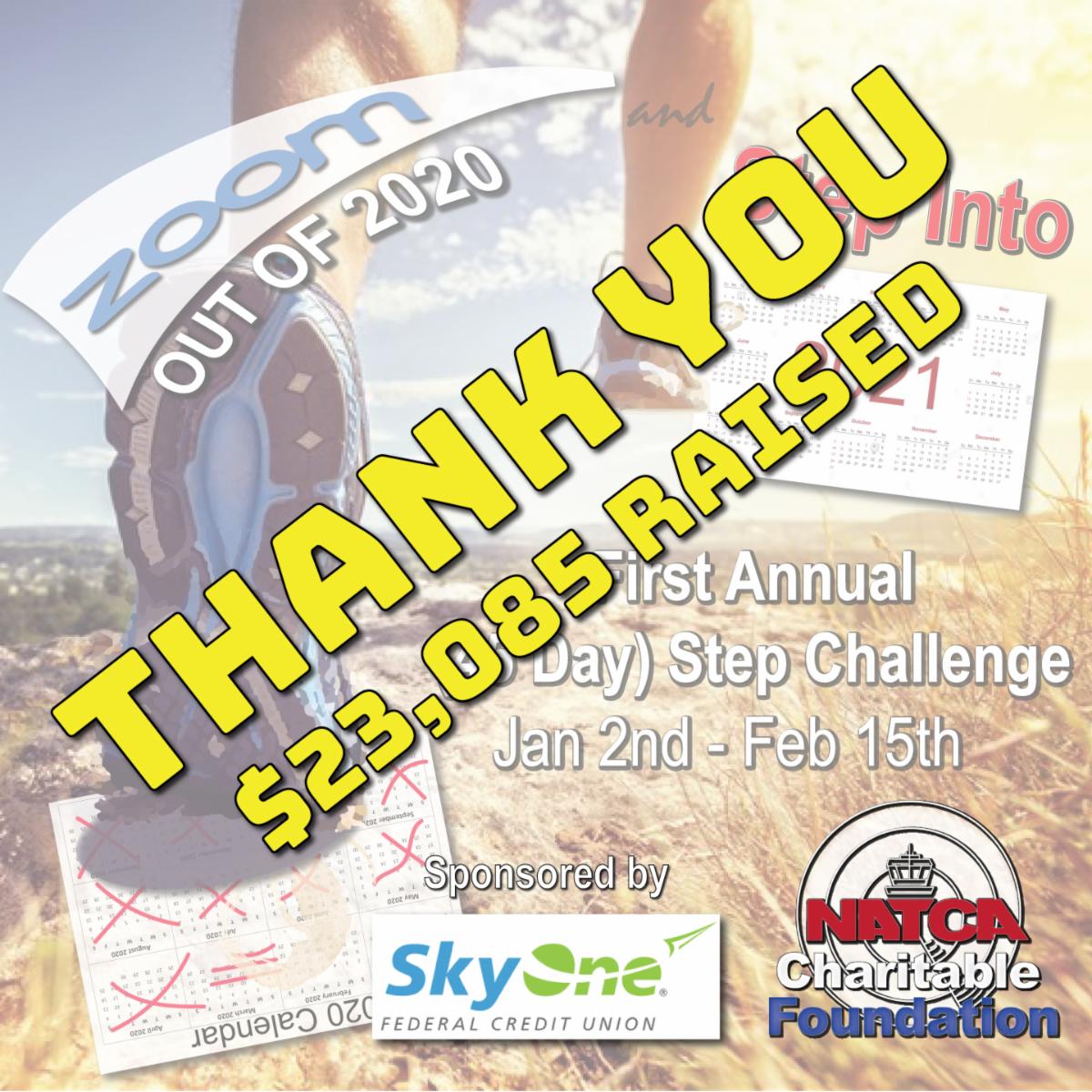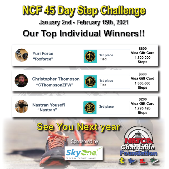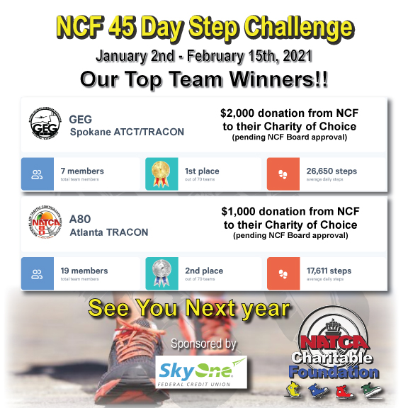 The NATCA Charitable Foundation's (NCF) First Annual Step Challenge ended on Monday, Feb. 15. Thank you to everyone who participated to support NCF. We raised over $23,000 and had over 800 steppers in this challenge. Steppers walked a total of 360,035,584 steps and 164,701.22 miles. We had 45 steppers walk over one million miles in 45 days.
