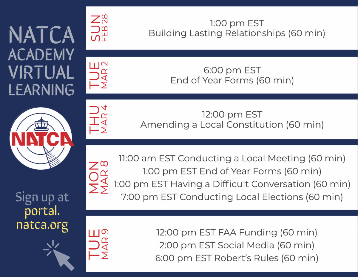 NATCA Academy classes for virtual learning are scheduled through the end of March. We hope that you will take this opportunity to learn more about your Union, your rights, and how you can become more active in the areas that interest you.