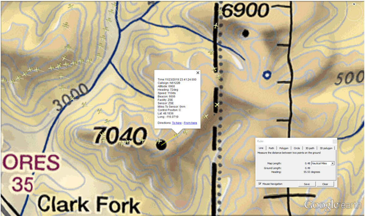 Perhaps the most harrowing part of Bendickson’s zig-zagging path above the mountainous terrain occurred near Scotchman Peak (pictured right), near the Montana border. It rises to 7,040 feet above the town of Lake Pend Oreille, Idaho. Bendickson’s altitude, captured in three successive radar updates: 7,000, 7,100, and 6,900 feet.