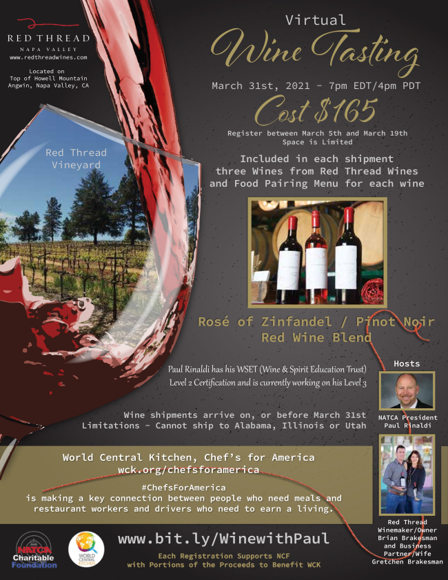 Join us for a virtual wine tasting with Paul Rinaldi and Red Thread owner and wine maker, Brian Brakesman. At this event, you will learn about three of Red Thread's fantastic wines, the winemaking process, food pairings, and life on top of Howell Mountain, Calif. Proceeds for this event go to the NATCA Charitable Foundation and to the World Central Kitchen, Chefs for America.