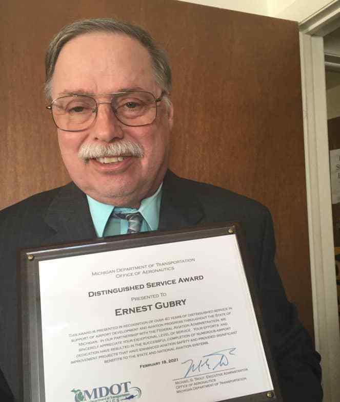 The Michigan Department of Transportation (MDOT) Office of Aeronautics recently presented a Distinguished Service Award to Region X member Ernest Gubry, a civil engineer in the Great Lakes Region. The award recognizes Gubry’s 40 years of distinguished service in support of airport development and aviation progress throughout the State of Michigan.