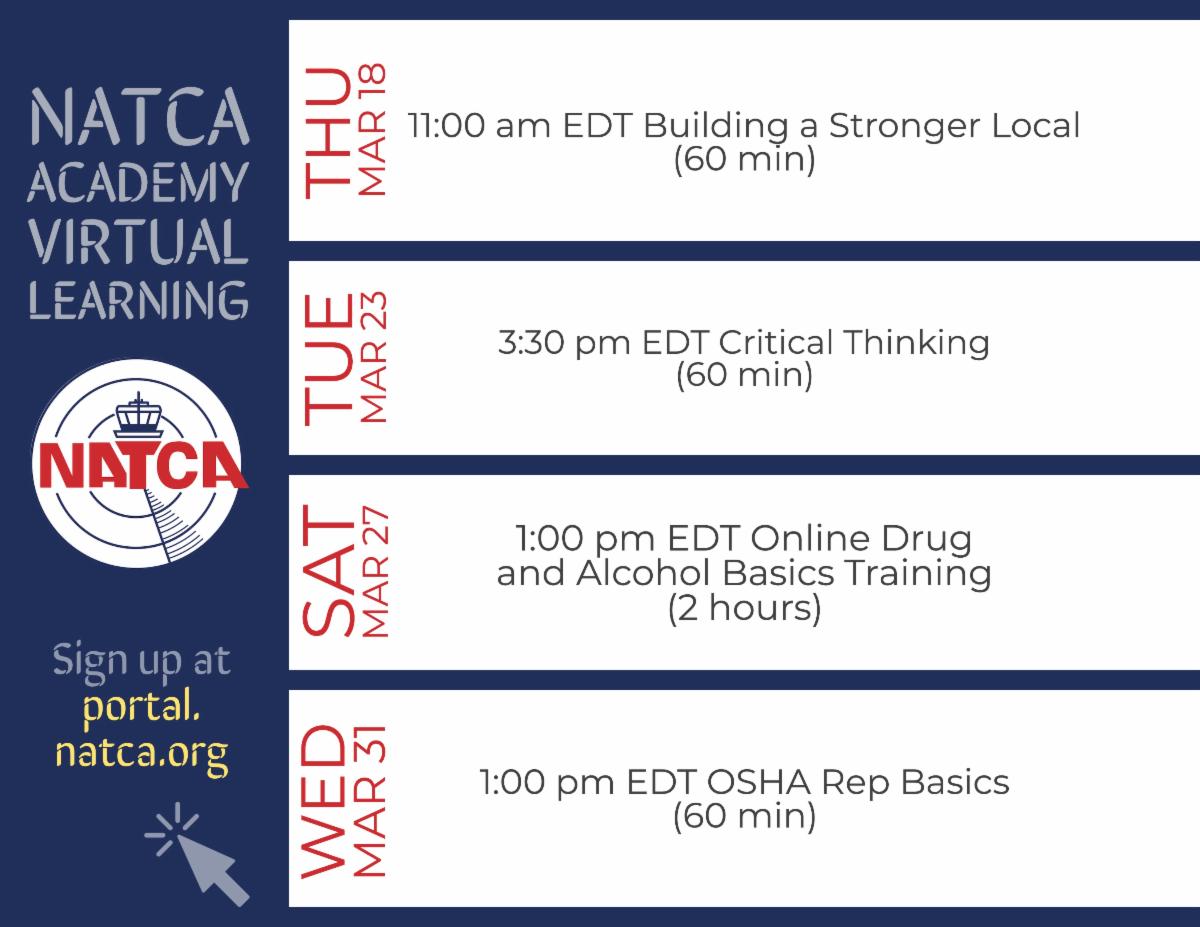 NATCA Academy classes for virtual learning are scheduled through the end of March. We hope that you will take this opportunity to learn more about your Union, your rights, and how you can become more active in the areas that interest you.