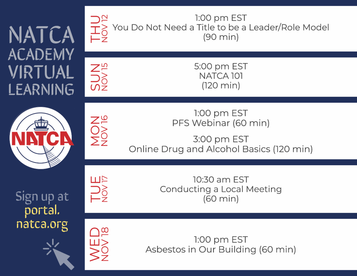 The NATCA Academy Virtual Learning program continues through November. We hope that you will take this opportunity to learn more about your Union, your rights, and how you can become more active in the areas that interest you.