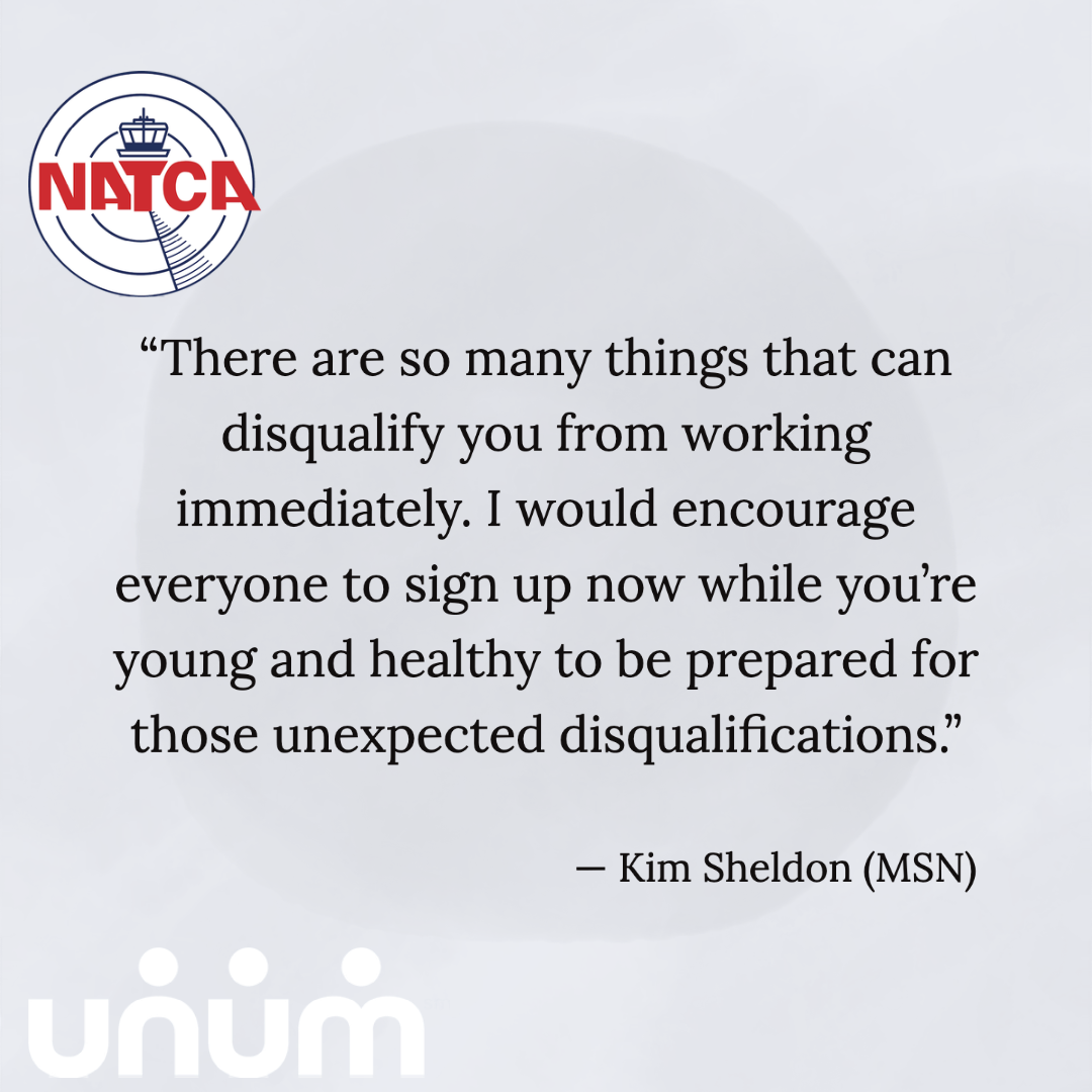 Having insurance grants peace of mind when the unexpected happens. The NATCA group long-term disability (LTD) program from Unum is the insurance that provides protection and peace of mind in the event you lose your medical or are disabled. Madison ATCT (MSN) member Kim Sheldon encourages all NATCA members to sign up for Unum during this open enrollment season: