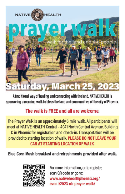 March 25 - NATIVE HEALTH's Annual Prayer Walk. North Mountain to NATIVE HEALTH Central. Registration required. For more information contact Lanasha.