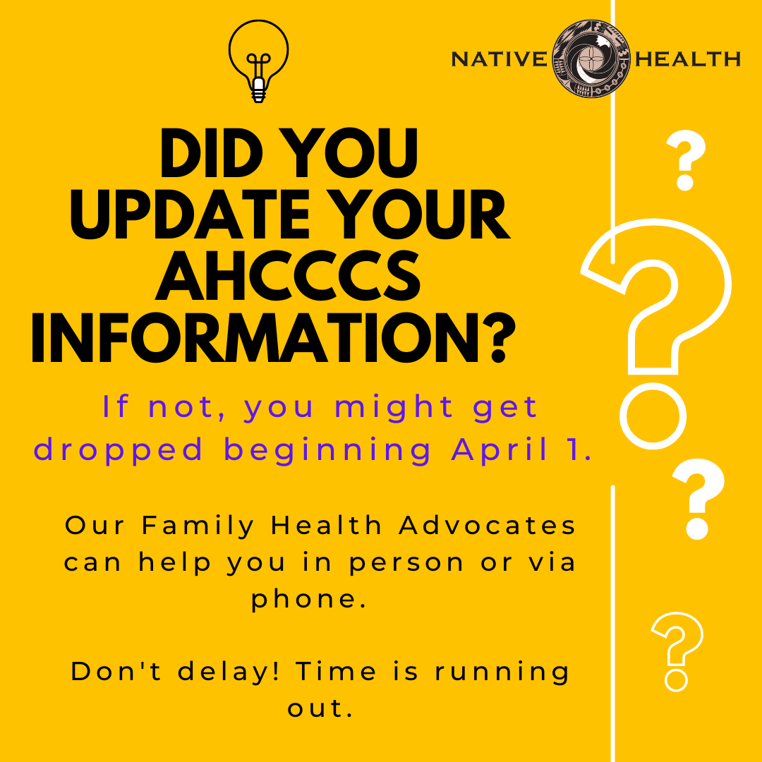 Beginning April 1, you may be dropped. NATIVE HEALTH has Family Health Advocates that can assist you in updating your information. It's fast, easy and they'll make sure your information is updated so you don't get dropped.