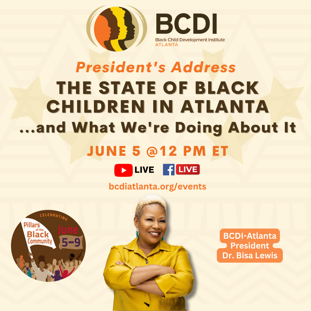 Join us Monday, June 5 at Noon on BCDI-Atlanta's YouTube channel or Facebook page for our President's Address - The State of Black Children in Atlanta ...and What We're Doing About It.