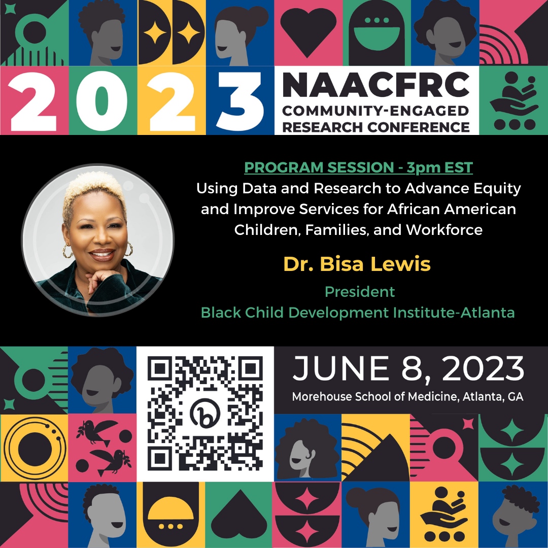 Dr. Bisa will serve on the Closing Panel at the National African American Child and Family Research Center (NAACFRC) Annual Community-Engaged Research Conference on June 8, 2023. This complimentaryfull-day hybrid event can be attended virtually or in person at Morehouse School of Medicine in Atlanta, GA.
