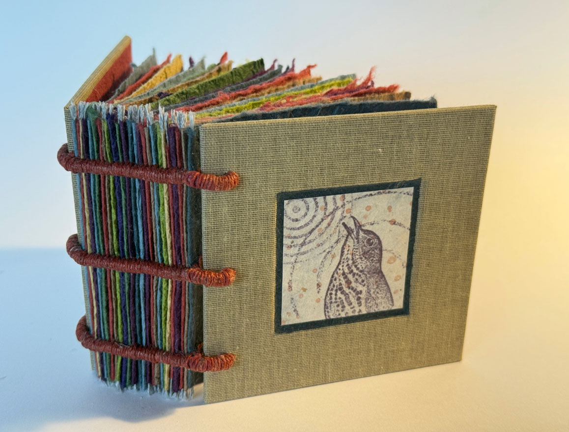 This workshop explores the historic binding technique of sewing on cords, re-imagned for contemporary bookmaking. Traditionally hidden within the spine, the cords in this variation are intentionally exposed, creating a striking spine. Instead of folded sections, the text block will be built from single pages of richly colored Japanese Momigami paper. Each page incorporates a thread embedded along the spine edge, making it possible to sew single pages across, rather than up and down, the spine. Participants will personalize their elegantly chunky books with content of their own design using collage, stamping, drawing, or writing.