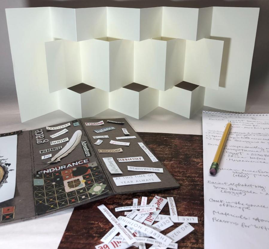 In this workshop we will explore what an artist might consider when creating or choosing text as content for an artist book. Suitable structures will be discussed as we consider the aesthetics and balance of text and images. Participants will create a nested accordion model, a new “foldable” that displays text well.