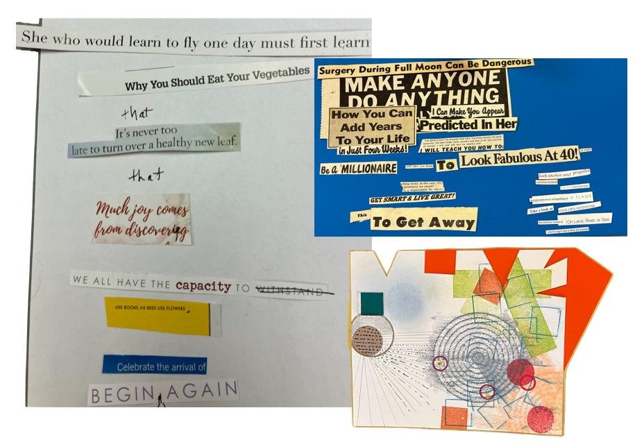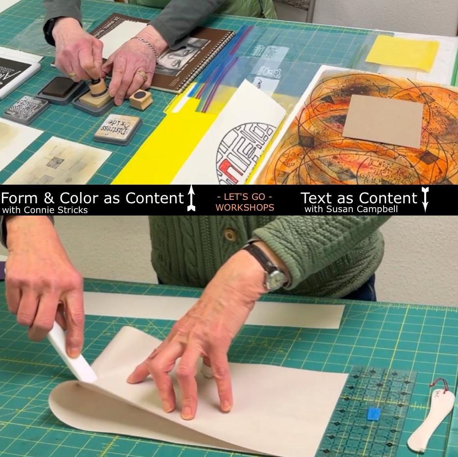 LET'S GO WORKSHOP HIGHLIGHTS: These are the working hands of instructor book artists, Connie Stricks and Susan Campbell, from the weekend of workshops in February. In Form & Color as Content, Connie's class, we worked with stamps and other materials, focusing on a few basic shapes. Text as Content, Susan's class, we made a nested accordion structure well-suited for text and then made cut-out and found poetry. Below are examples of the work we made from Lois Henderson and Vanessa DeWolf. | |