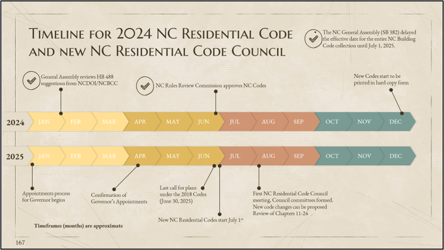 SB 382 (Disaster Relief-3/Budget/Various Law Changes) delayed the effective date of both the commercial and residential codes until July 1, 2025. This means you can apply for a permit under the current 2018 NC Codes until the close of business on June 30, 2025, and complete your project using those codes. However, if you prefer, you may choose to use the new 2024 NC Codes as an alternative.
