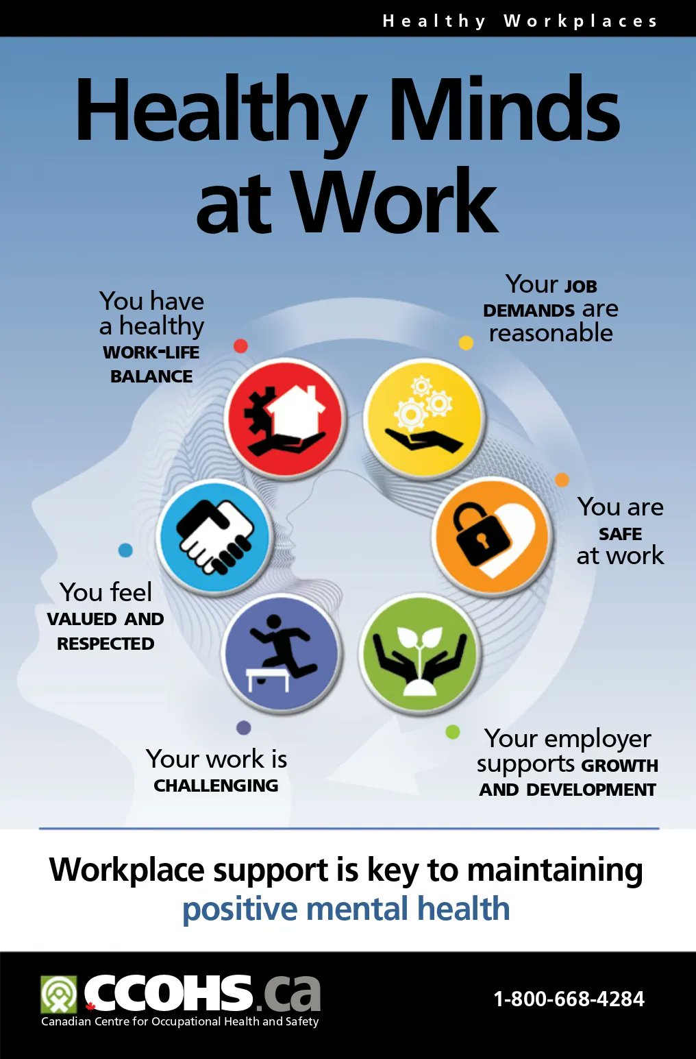 Here are some tips to stay mentally healthy at work: it’s a good idea to get up and get outside for a quick break and fresh air, try and keep work tasks in perspective and remember when work ends, and your home life begins.