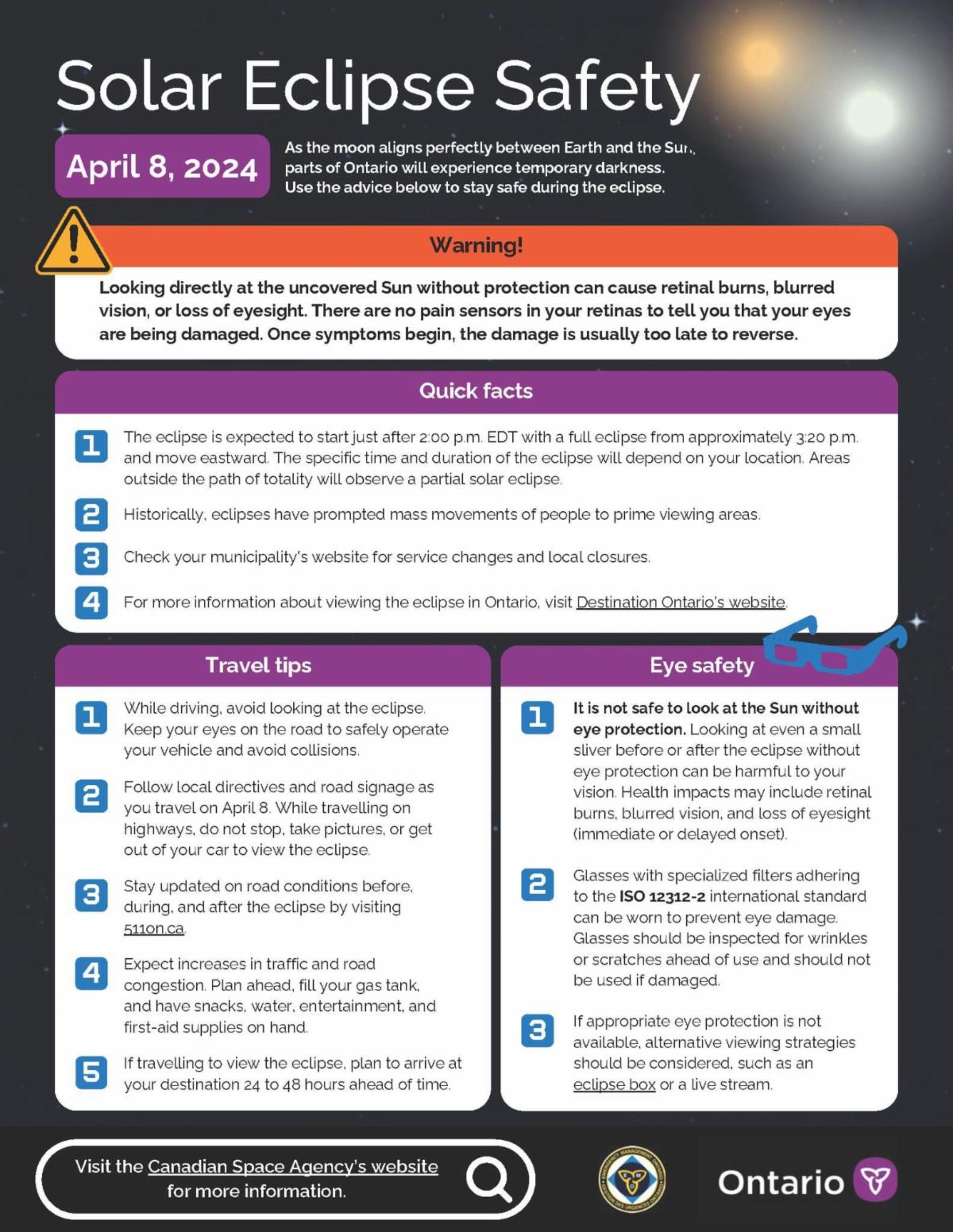 On Monday, April 8, 2024, a total solar eclipse will cross North America, briefly turning day into darkness for a portion of the continent—including southern Ontario. Depending on where you’re located in the province, the eclipse will be visible between 2 and 4 p.m.