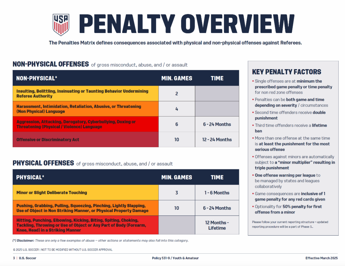 In response to the alarming rate of referee abuse incidents in recent years, U.S. Soccer has taken action by adopting a new Referee Abuse Policy (RAP) that includes strong sanctions for any form of physical or non-physical abuse towards referees. Get to know the rules, so you can avoid penalties and do your part to create a positive playing environment.