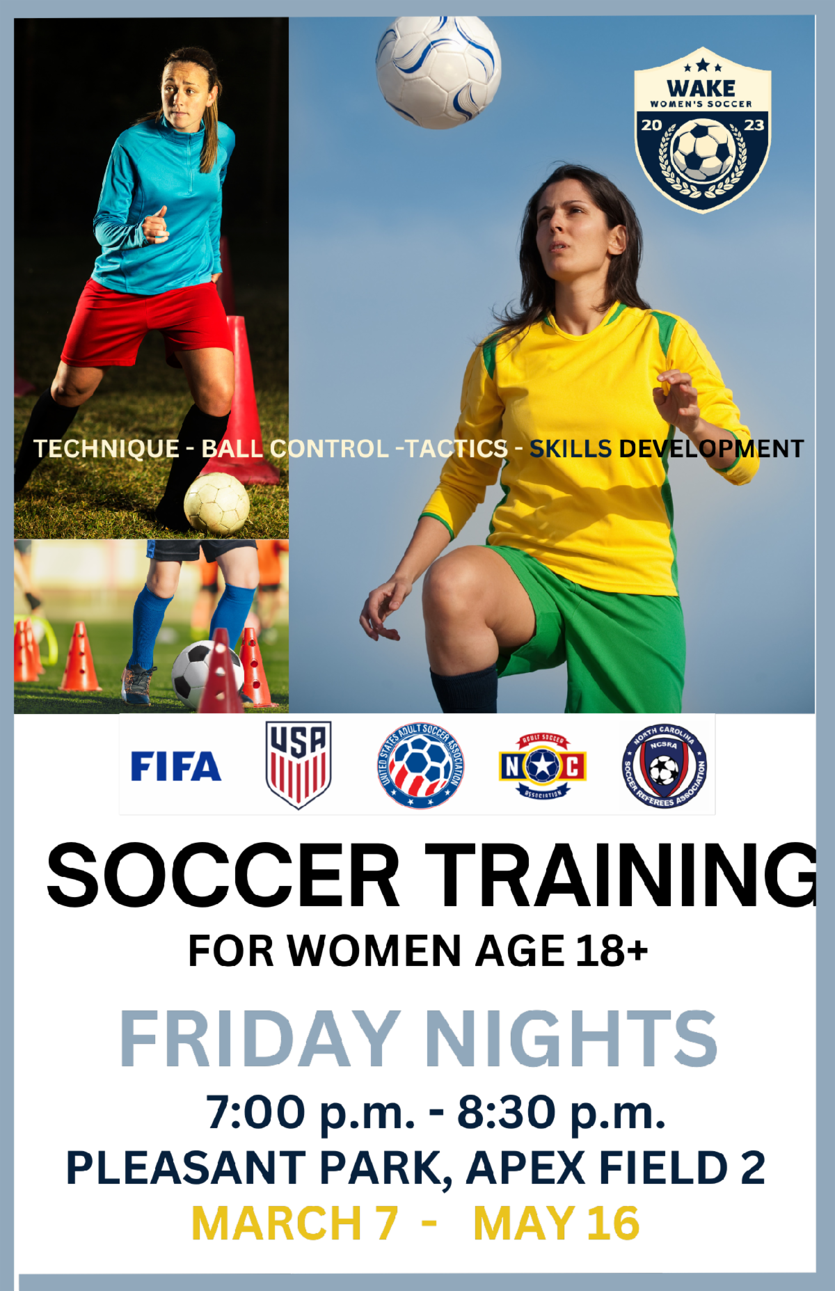 The fun and intensive sessions cover ball control, passing, offensive and defensive tactics, foot skills, and finishing! Players can sign up for a single session, or purchase 5- or 10- session value bundles. If you’re in the Triangle area, check it out! Women players 18+ are welcome. Training starts March 7!