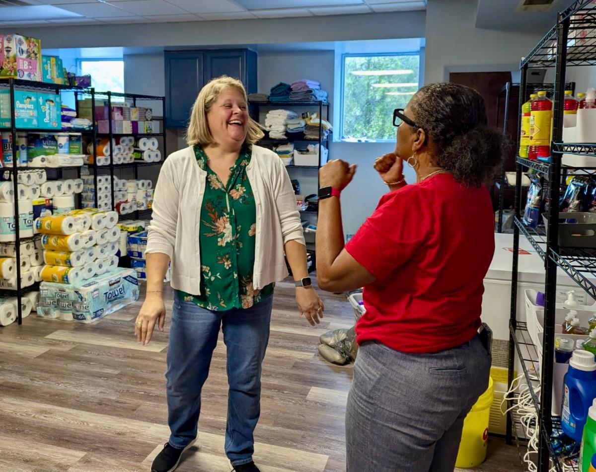 Meeting at the Passage Home Pantry, where families receive bi-weekly food deliveries, Sharon and Amy shared ideas, visions, and high-fives as they explored future opportunities to strengthen services for those in need.