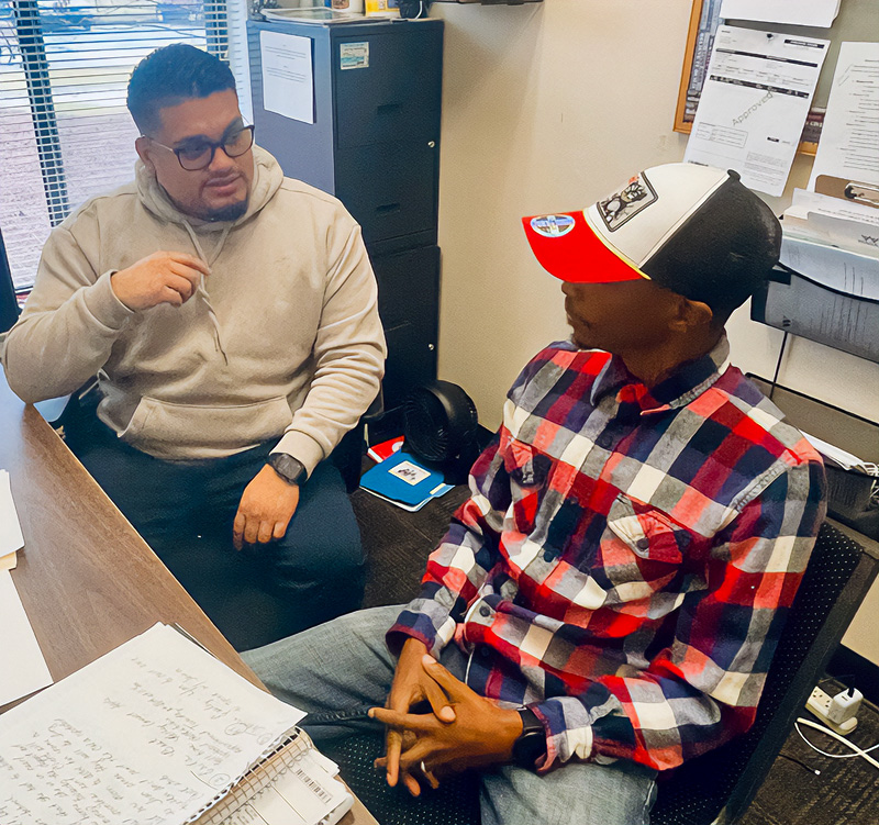 Javier Murillo, WAGES, Inc., CSBG Case Manager and Head Start Male Involvement Coordinator, discusses future educational plans with Lonnie Atkinson, CSBG participant. | |