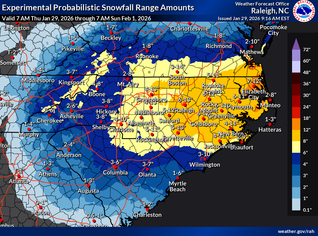 - Widespread snow accumulation of at least 2-4” with 6”+ likely are forecast across central and eastern NC. Significant snowfall amounts up to 10-12”+ are also possible, especially along and east of the I-95 corridor. Snow accumulation of 3-8” is possible across the mountains and Foothills.